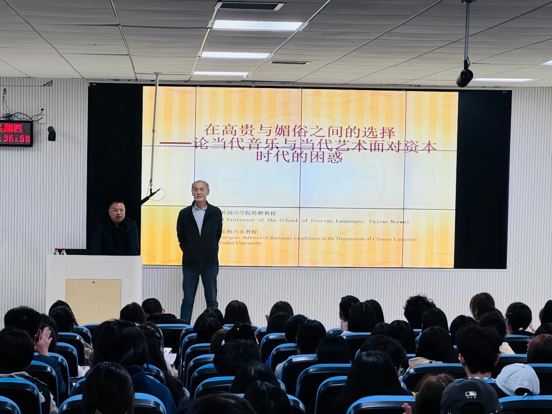 本网讯(文学院 徐宁 报道/摄影 王潇卿)10月23日,由贵州财经大学主办、文学院承办的“名师名家进校园”学术活动在乐学楼举行。本次活动特邀复旦大学中文系杨乃乔教授作题为“在高贵与媚俗之间的选择——论当代音乐与当代艺术面临时代的困惑”的学术讲座。文学院院长杨经华教授主持讲座。